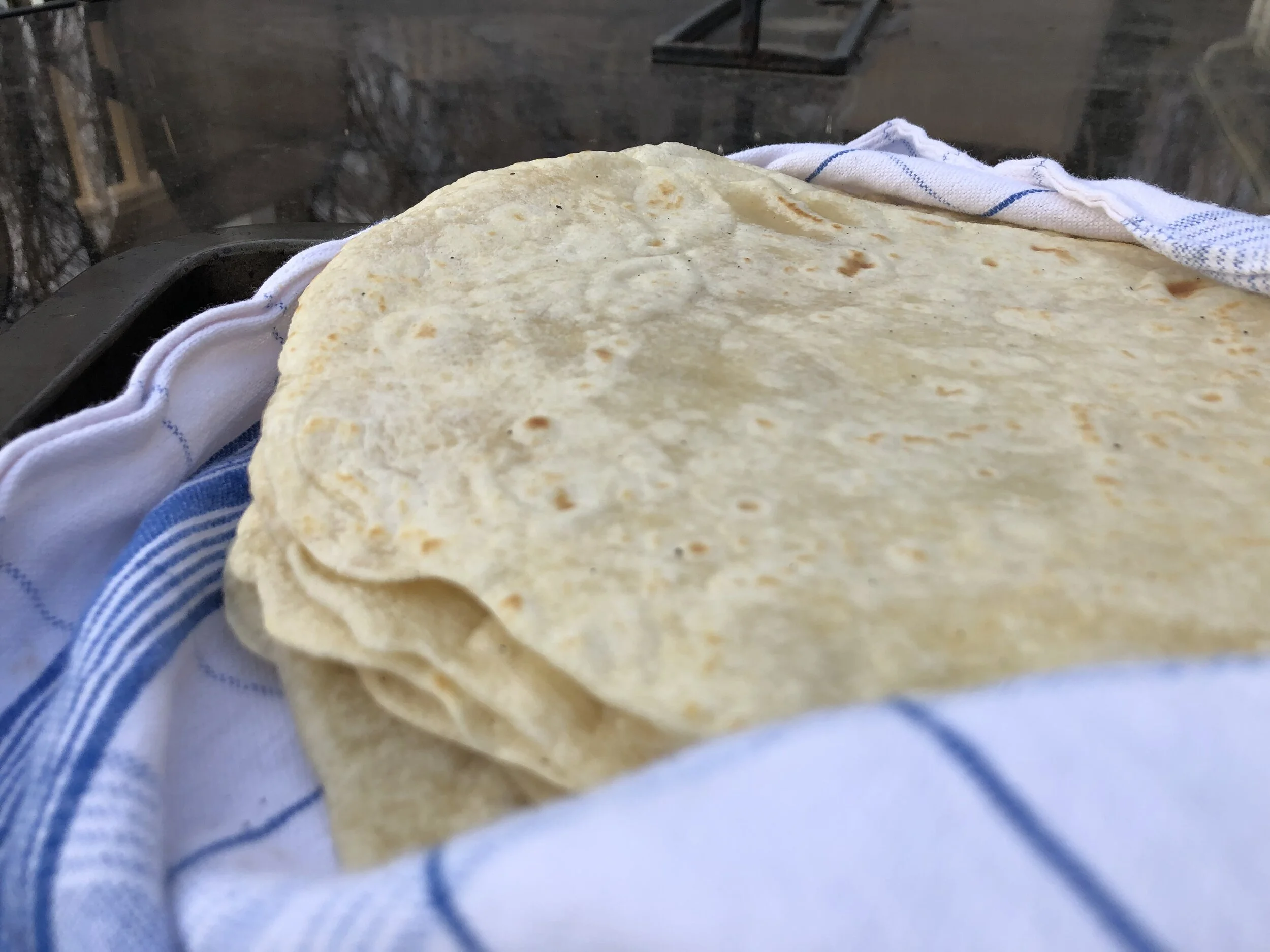 Carefully peel dough off work surface; transfer to hot skillet. Cook until lightly browned in spots and pliable, 20 to 30 seconds per side. Wrap tortillas in a kitchen towel.